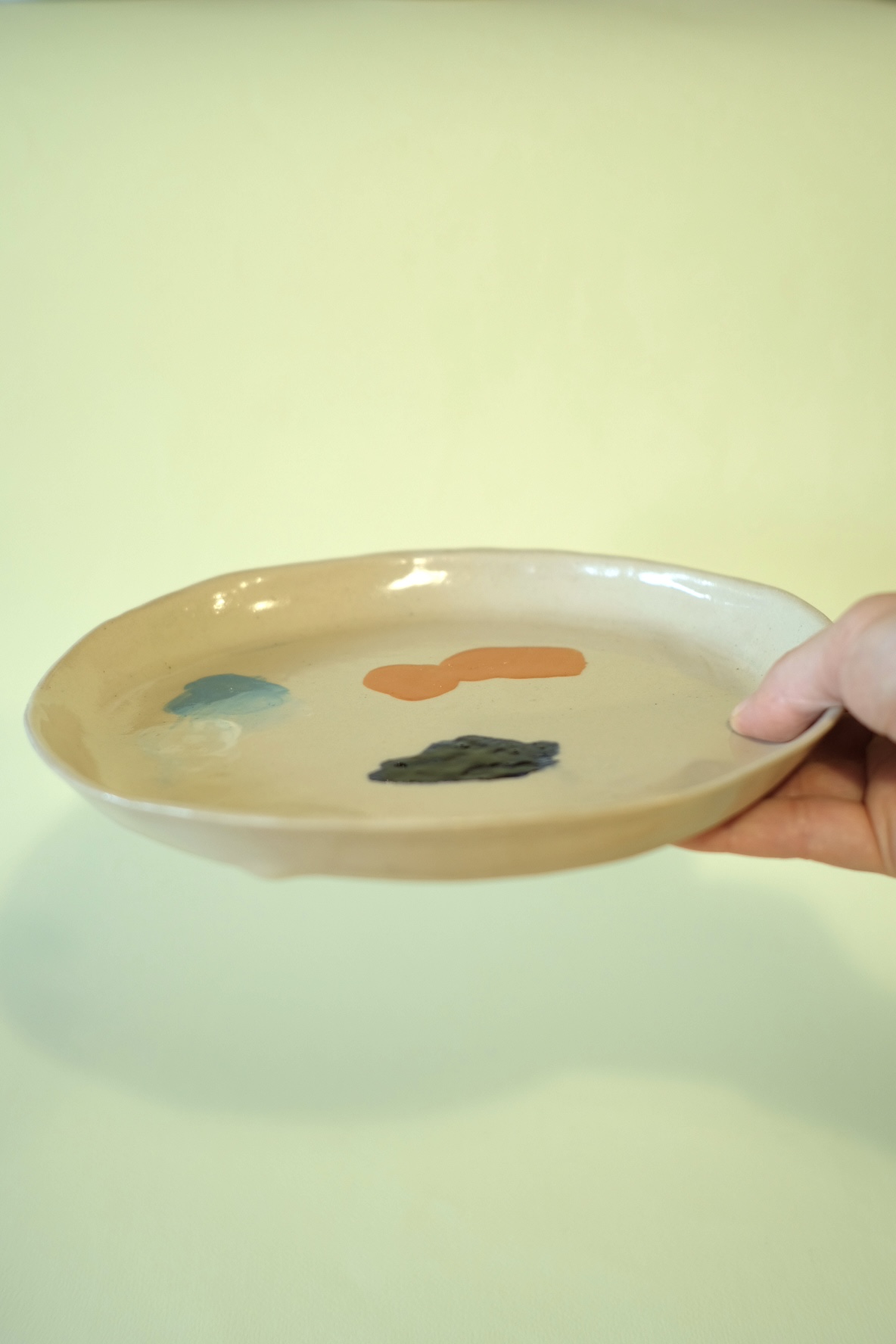 Assiette réalisée à la main dans mon atelier landais. Je suis artiste et le motif que je peins sur ma vaisselle est inspiré de mes palettes de peinture. Chaque pièce est unique. Diamètre 23 cm
