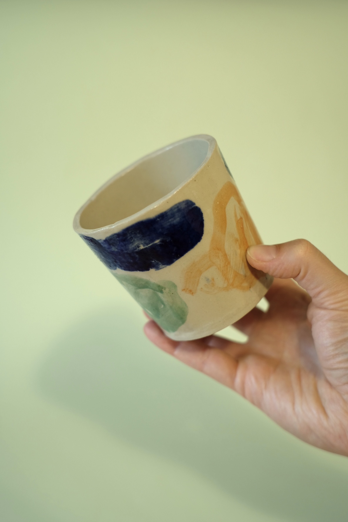 Tasse réalisée à la main dans mon atelier landais. Je suis artiste et le motif que je peins sur ma vaisselle est inspiré de mes palettes de peinture. Chaque pièce est unique. Diamètre 10 cm, hauteur 8,5 cm